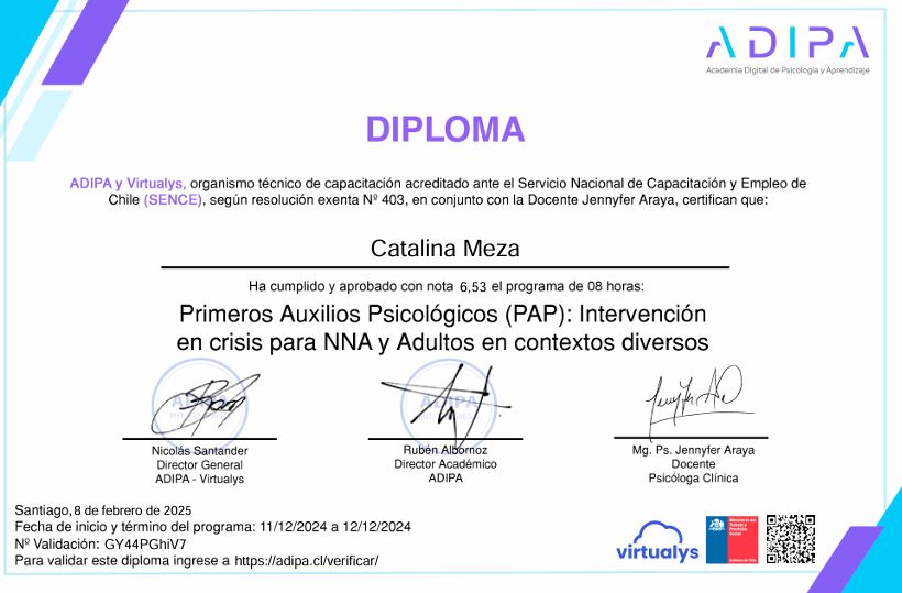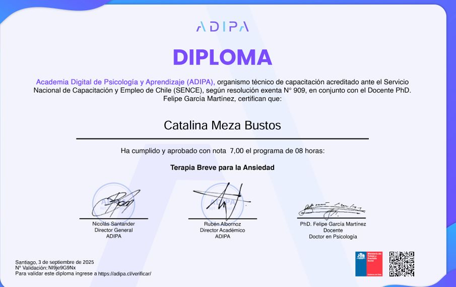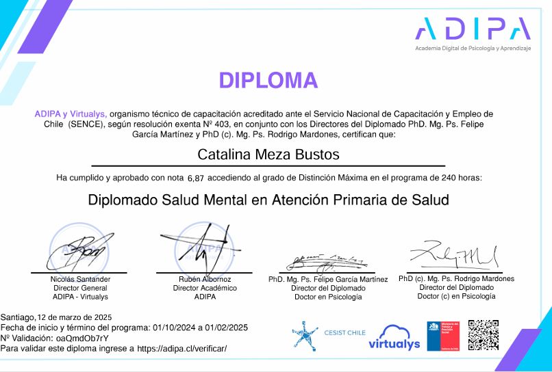 Cuento con formación en Terapia Cognitivo Conductual (TCC), salud mental en atención primaria e intervención en crisis. He trabajado en el abordaje clínico de problemáticas asociadas a salud mental, violencia de género, estrés y conflictos familiares, integrando una mirada psicológica y social para comprender a la persona dentro de su contexto.